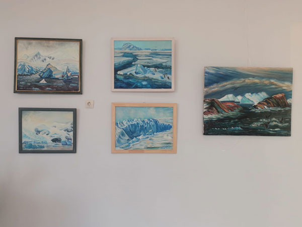 В выставочном зале школы номер 1409 оформлена экспозиция 37 картин написанных в Арктике и Антарктике.