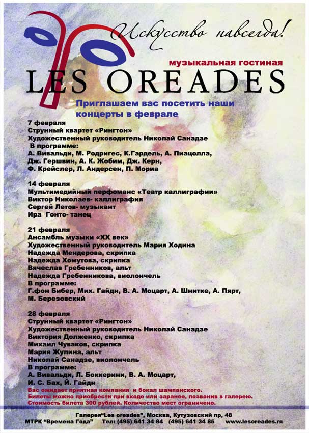 Каждую субботу в 19:00 Музыкальная гостиная  галереи Les Oreades собирает друзей.